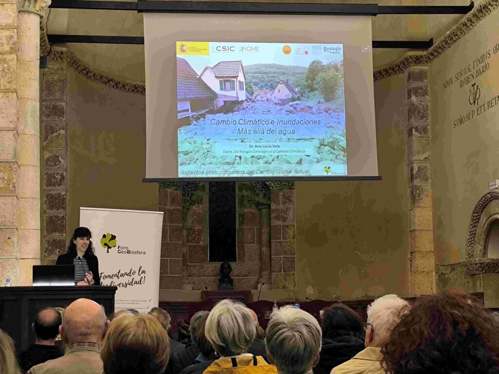 - 2025-05-10. Conferencia «Cambio Climático e inundaciones. Más allá del agua» impartida por Ana Lucía Vela (IGME-CSIC) en la 4º Jornada «Aspectos poco conocidos del Cambio Global Actual», Aula de la Real Academia de Historia y Arte de San Quirce». Foro GeoBiosfera.