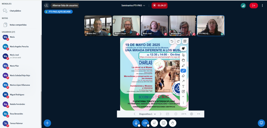 - 2025-05-19. Conferencia “Inundaciones y Museos, y viceversa”, Jornada por el Día Internacional de los Museos “Una mirada diferente a los Museos”, Plataforma Temática Interdisciplinar (PTI) Patrimonio Abierto: Investigación y Sociedad (PAIS), CSIC. Transmisión telemática vía CSIC Conecta. (20 minutos).