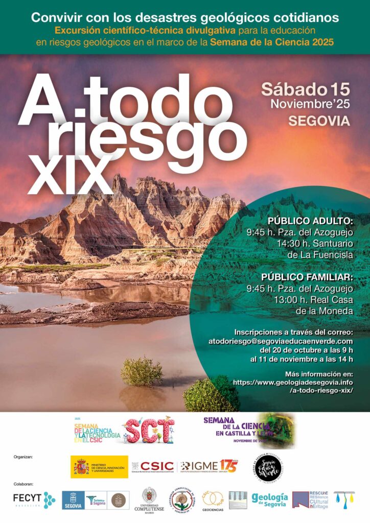 - 2025-11-15. Excursión divulgativa «A todo riesgo XIX. Convivir con los desastres geológicos cotidianos», en el marco de las Semanas de la Ciencia del CSIC en la Comunidad de Madrid y de Castilla y León.